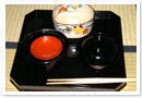 ![]() 運ばれてきたお膳の中身は・・・・・ ご飯に白味噌の椀物と鯛のお刺身 |