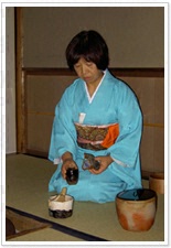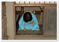 平成の世とは思えない原始的な音が、こけむして程よく湿った濃緑の内庭に響きわたります。その合図後、庭の蹲踞(つくばい)で手と口内を清めてから順に茶室ににじり入(い)るのです(にじり入るとは写真の様に正座をした体勢でズリズリと入室すること)。