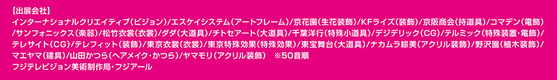 - インターナショナルクリエイティブ(ビジョン)・エスケイシステム(アートフレーム)・京花園(生花装飾)・ KFライズ(装飾)・京阪商会(持道具)・コマデン(電飾)・サンフォニックス(楽器)・松竹衣裳(衣裳)・ダダ(大道具)・チトセアート(大道具)・千葉洋行(特殊小道具)・デジデリック(CG)・テルミック(特殊装置・電飾)・テレサイト(CG)・テレフィット(装飾)・東京衣裳(衣裳)・東京特殊効果(特殊効果)・東宝舞台(大道具)・ナカムラ綜美(アクリル装飾)・野沢園(植木装飾)・マエヤマ(建具)・山田かつら(ヘアメイク・かつら)・ヤマモリ(アクリル装飾)※50音順