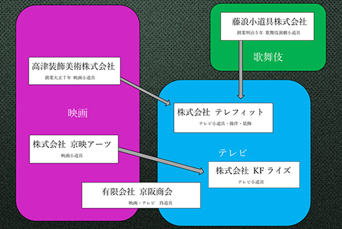 山本いいえ、ウチも映画から始まりました。最初は昭和30年に映画の持道具会社として、京都の太秦撮影所に設立しました。その後、テレビ局が開局して忙しくなるということで、東京にも進出して現在に至るというところです。