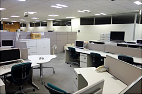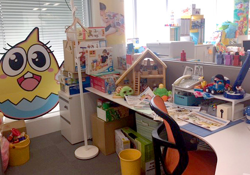 主人公が勤める玩具メーカーのセットは、スタジオを飛び出して通常はスタッフが作業する、オフィススペースに作りました。