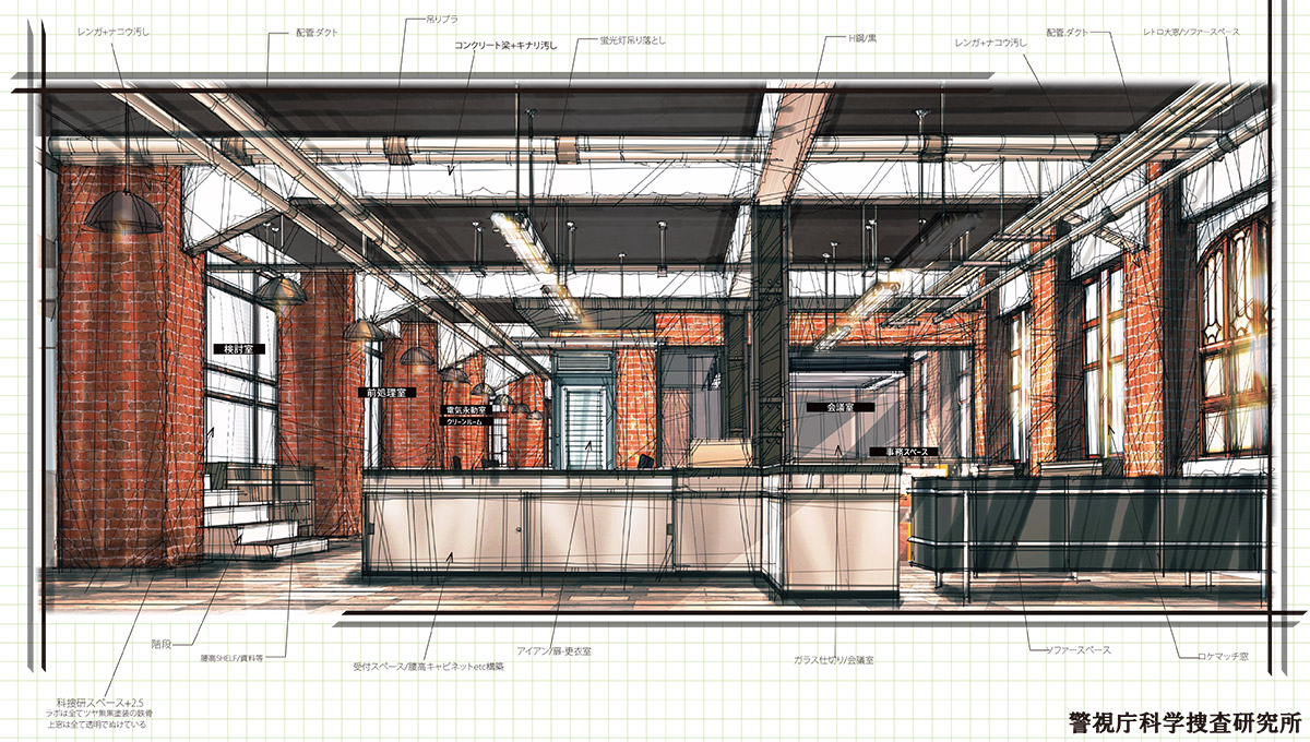 いえ、それが出来れば良かったのですが、科捜研というところは、警察の本部内にあるということ以外、一切の情報を公開していないんです。当然、取材もNG。なので、内部の構成が全くわからなくて……。ただ、原作が古賀慶さんのマンガで、古賀さんが科捜研の元研究員だったので、唯一のリアルな参考として、ひたすらマンガを検証しました。あとは、民間の科捜研の方に話を聞いてデザインを積み上げていきました。