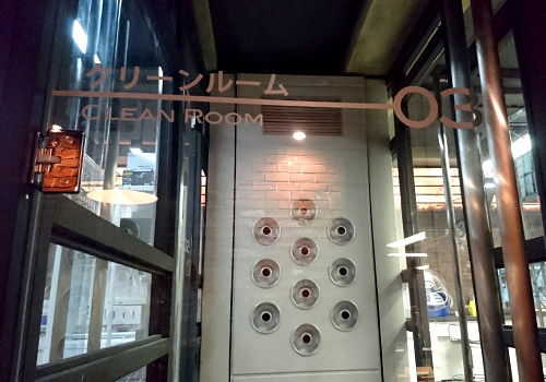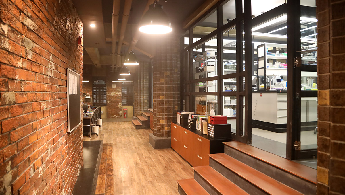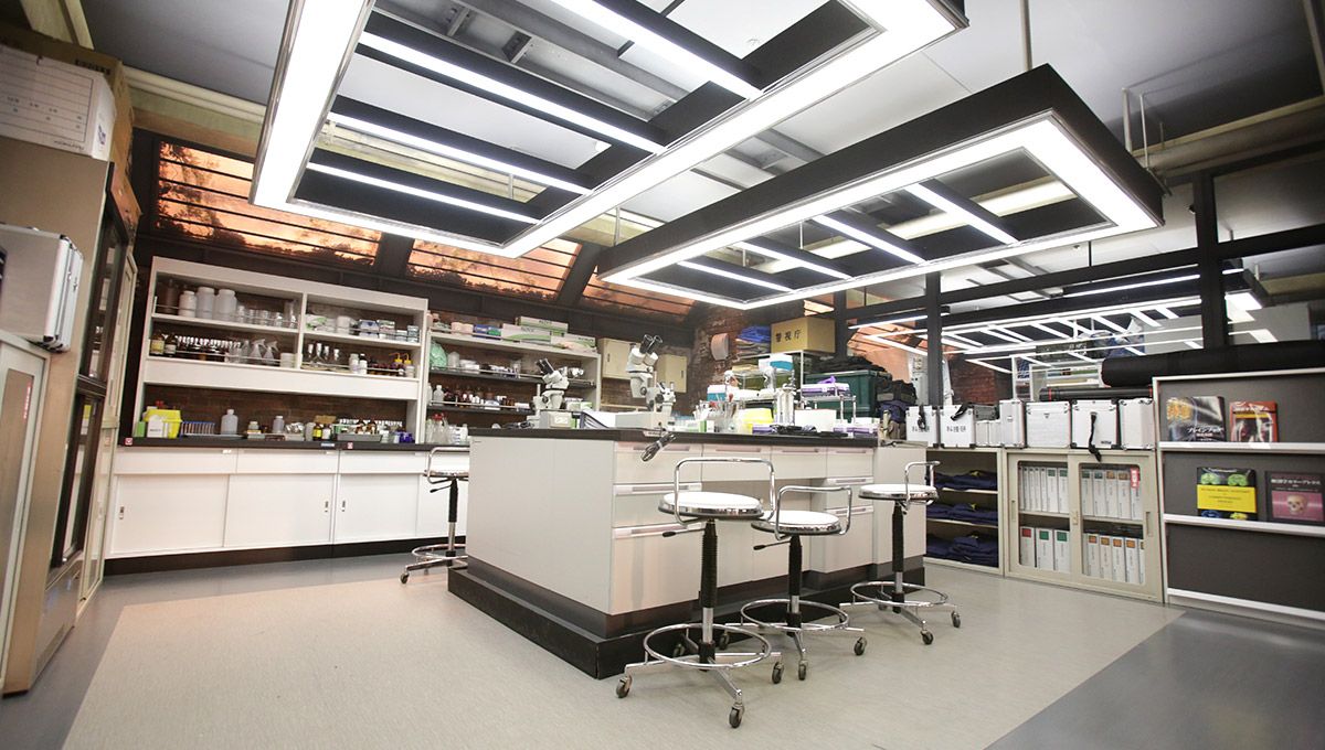 通路を挟んだラボスペースは、対照的なブルー系の照明。
