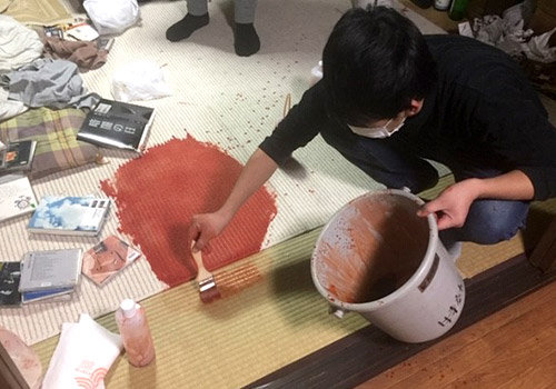 ただいま、特殊効果のスタッフが血だまりを制作中。