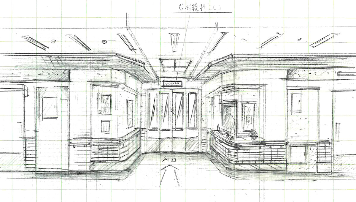 それぞれの検査室の間の距離も近くて、オープンスペースの廊下で技師同士が画像を見ながら会話をするんです。連携してやっている、という印象でした。そのリアルな構造をそのまま取り入れたのがこのデザインです。