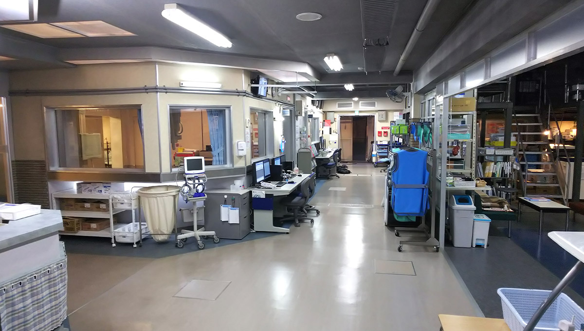 実際の病院では読影室はX線検査室から離れた所にあるのですが、セットでは「撮影する技師」と「診断する医師」の両者の世界を交わらせたくて、あえてすぐ近くに置いています。まあ、もしスタジオの広さが今の1.5倍ぐらいあったら、渡り廊下でつないだりして、もっとリアルに近づけたかもしれませんが(笑)。