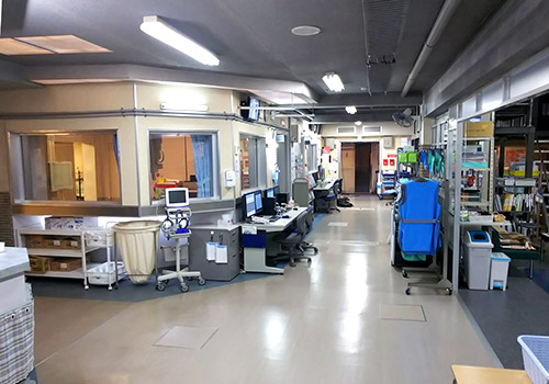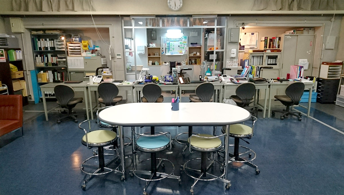 実際の病院では、技師達のデスクは普通のオフィス同様、向き合った配置です。