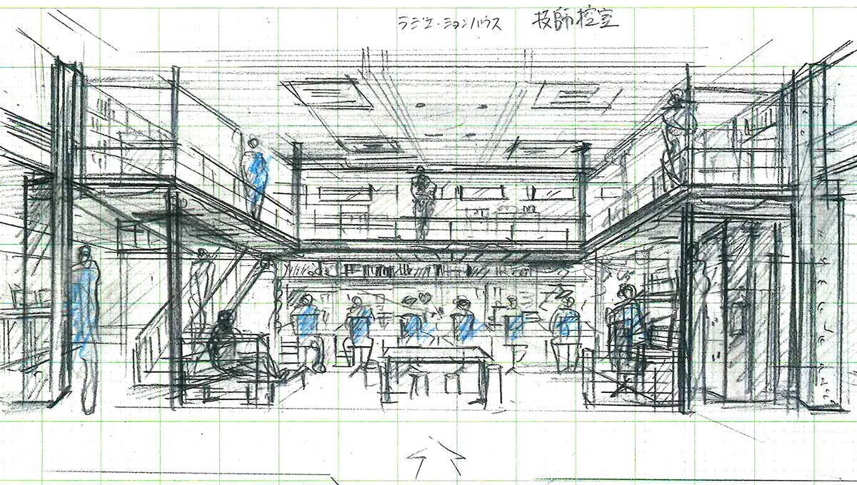 どうしても横長の配置になるなぁ、と思案していた時に、監督と雑談していて、いっそのこと横一列にしてみるか、という話が出て、試しに図面に描き入れてみたら意外と面白いデザインになったんです。