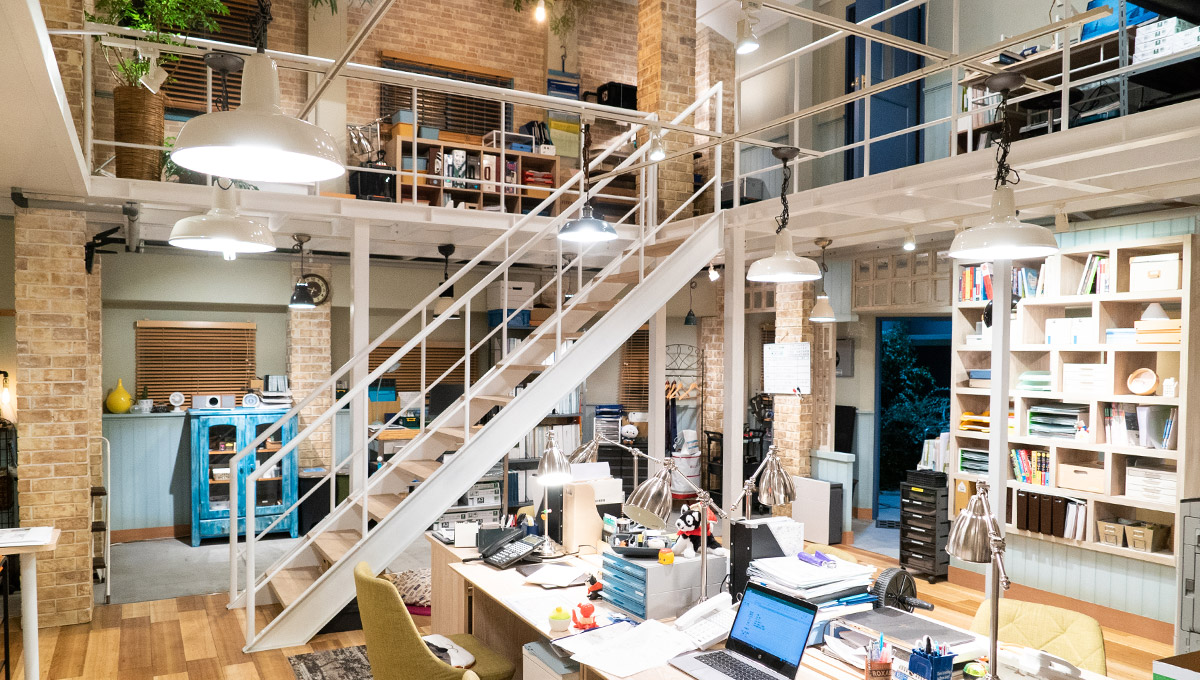 2Fにも上がれる開放的なオフィスはセット撮影。