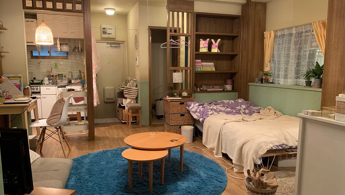 ラブコメのヒロインの部屋なので、色調を明るくしたいと思いました。でも実は、このセットは直しが一番多かったんです。新木優子さんのイメージでミントブルーをキーカラーにしたのですが、出来上がりの壁の色などがどう見ても水色で「チロリアン不動産」の色味に近くなってしまったので、壁紙の上からエメラルドグリーンに塗り直しました。木(モク)の色調もトーンを落として暗めの色合いにしました。それも不動産会社の白木と差別化するためです。