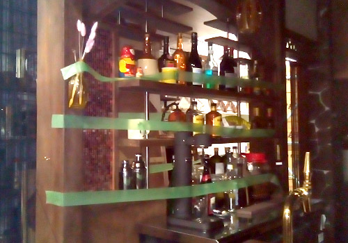 「BARネコ目」の装飾でしょうか。店のあちこちに“ネコ感”(笑)を出したくて、漫画原作に1回だけ出てきた猫の目のマークをヒントにして、最初に店名のロゴから決めました。コースターもデザインして小道具にしています。あとは、猫のひっかき棒をイメージした手すりを付けたり、欄間やステンドグラスを爪でひっかいたような模様にしたりと、至る所に猫を連想させるパーツを盛り込みました。特に見ていただきたいのは、柱の石模様の1つが肉球の形になっているのと、手すりに使っている爪とぎ用の麻縄。そういった細かい遊びの部分も見つけて楽しんでいただけると嬉しいですね。
