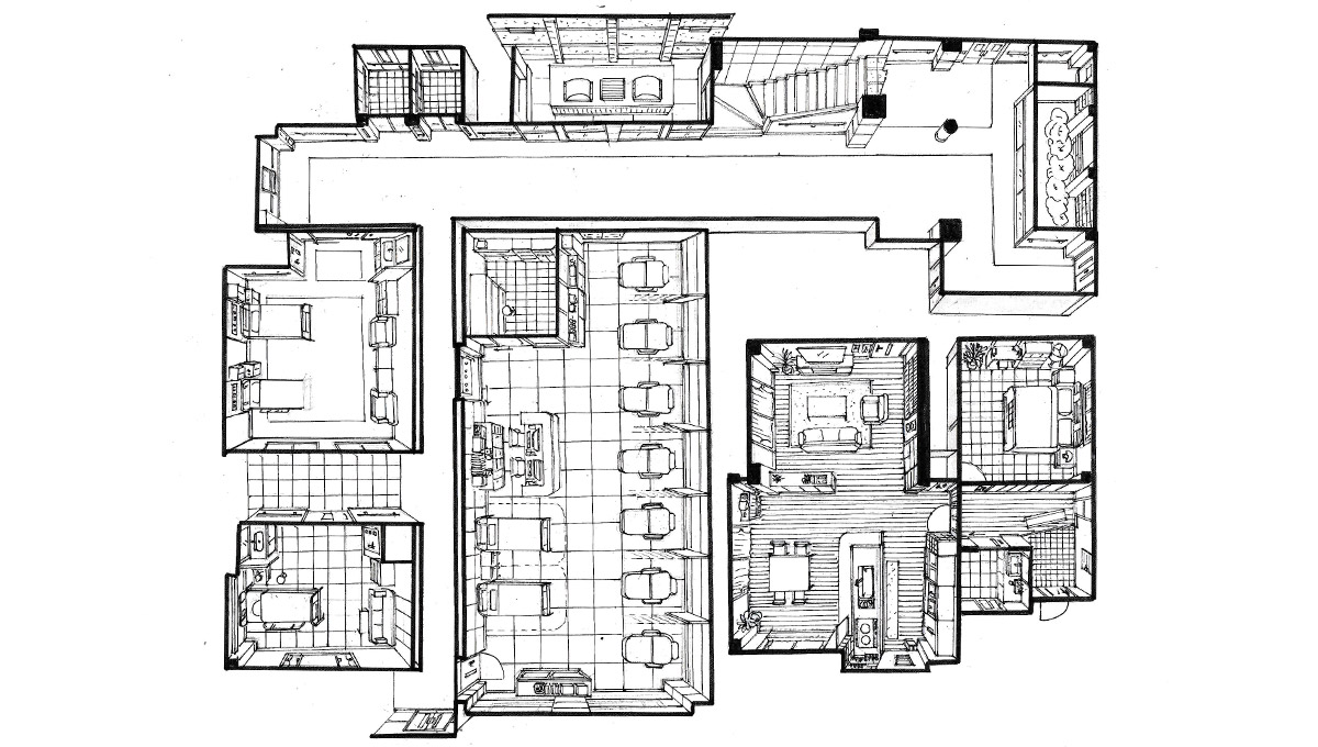 これは実際のスタジオにどのセットをどう配置するかを示す平面図。俗に“入れ込み”と言われています。今回は病院の基本セットを入れ込み、もう1杯は飾り替えです。