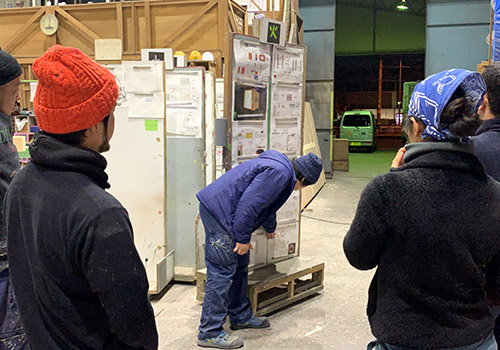 通常、工場で作ったセットパーツをスタジオで組み立てるので、資材の厚みや材質による伸縮も計算に入れ、