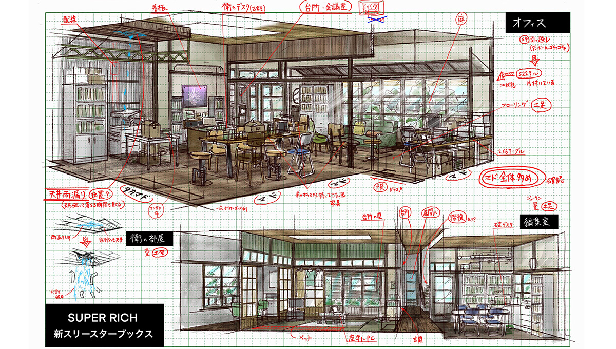 はい。でも実は、転落した後の会社をああいう形で出すということは、最初は全く決まっていなかったんです。リッチな会社としての「スリースターブックス」はもちろん決まっていたのですが、それ以外のセットについては、当初、社長の高級マンションの部屋と中華料理店の2つのセットを建てる予定でした。家と新会社を兼ねたセットをつくると決まったのは、華やかな「スリースターブックス」を建ててしばらくしてからです。