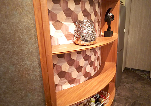 棚のウラはこんな風。背板のパーツでは“曲げベニヤ”が本領を発揮。頑張れば、割れずにもうちょっと曲がります。