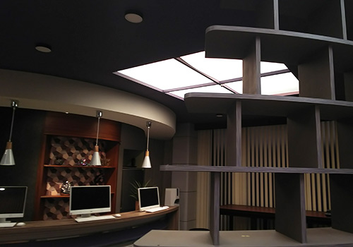 リッチなオフィスの広さの出し方、ですね。実際のウェブ出版会社を見ると、大抵が広いスペースにテーブルが点在している感じです。でもスタジオのスペースには限界があるので、いかに少しでも広く見せるかで悩みました。