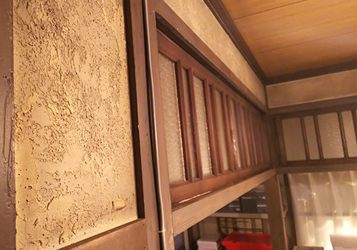 監督からは「とにかく“転落感”を出して」と言われたのですが、この民家に多い時で14人くらいのキャストが入るので、ある程度のスペースも確保する必要があって、広いけれど貧しく見える空間を作るのに苦労しました。具体的には、貧しさを表すのに“汚し”を強めに入れました。人が住もうと思わないくらい「古い」、でも「汚く」はならないように。たとえば、壁には隙間風が入りそうな波トタンを使ってさびを入れたり、壁紙を剥がしたり、壁のしみは多すぎると「汚く」なるので少しだけ入れたり、と。