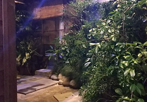 波板に溜まった枯れ葉。これも装飾スタッフの仕掛けです。