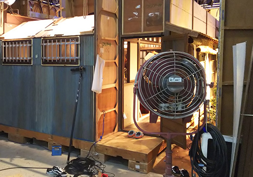 はい、家屋の中の芝居空間を広く取ったら、その分バックヤードが狭くなってしまって、撮影しにくくなってしまったんです。それで、当初は建てっぱなしの予定だったセットを、一部の壁にキャスターを付けて簡易的に建てバラシができるようにして、カメラスペースを何とか確保しました。