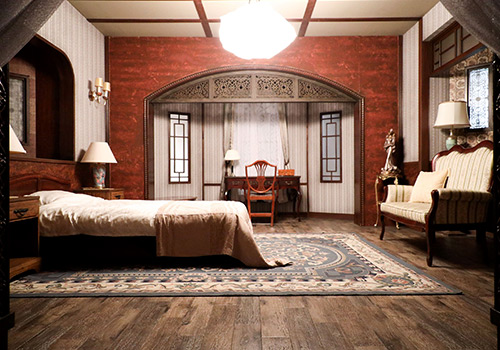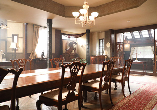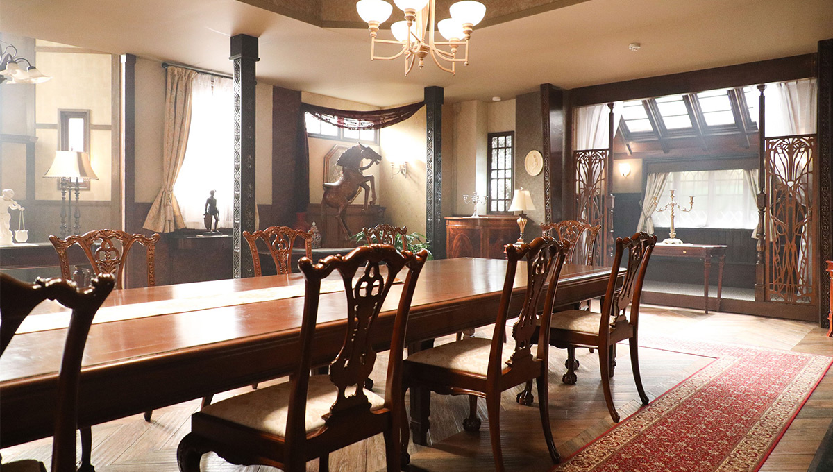 ― 「クラシックミステリー」ということなので、西洋風の重厚感を意識しました。といっても、普通にデザインしてしまうと「ホテルのロビー」になってしまう。あくまで個人の別荘ですから「趣味性」や「クセ」が感じられる空間にしています。“一品モノも多いのにどこか統一性もある”というニュアンスを出すため、装飾スタッフとはかなり細かく打ち合わせをしました。