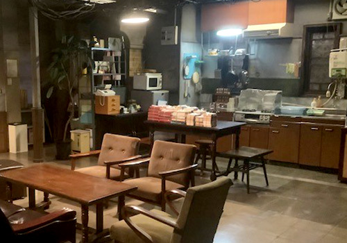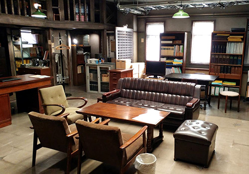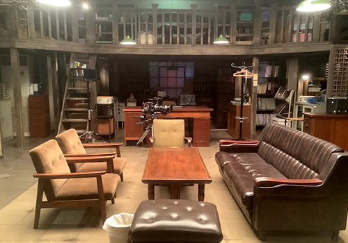 ボロボロの事務所で「もらっても、ほどほどに要らない物件」というイメージです。この“ほどほどに”のニュアンスで苦労しました。“昭和感”満載のボロい物件というよりは、少し外国映画っぽいクラシックなところもある落ち着いた空間を目指したのですが、バランスが難しい。一度本当にボロボロのソファを置いてみたのですが、監督から「やり過ぎ」と言われてやり直したこともありました。構造的には正面奥がロフトになっているのが特徴で、手前と奥の芝居ができるようにしています。