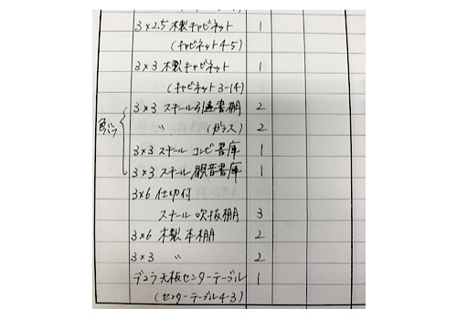美術セット内の飾りに必要な物のリストが、小道具の「附帳」です。これは「暮らしの法律事務所」を飾るための附帳の一部。