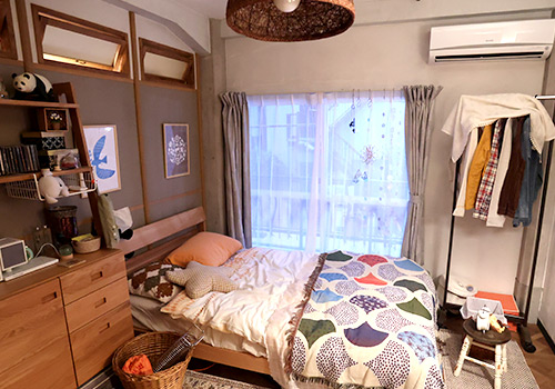 生活感が感じられる温かみのある部屋にしようと、全体的には木調にしています。リノベーションされた古いアパートということで、ちょっとしたオシャレさも取り入れた明るめの部屋です。洗濯機や乱雑な棚など、人が暮らしている部屋だと感じるところもありますが、よーく見ると壁の一部が変わったデザインだったり、ブランケットがユニークだったりとセンスの良さが垣間見えたりします。