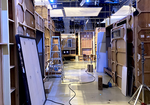想の実家である「佐倉家」がロケーション撮影です。制作部が見つけてきた空き部屋を、大道具スタッフや装飾スタッフが変身させました。スタジオと違って実際の部屋ですから、撮影機材の動線から考えなければなりませんし、そもそも人が暮らしやすいように部屋ごとに間仕切られていることが多いんです。今回はリビングとキッチンの位置関係をドリーショットで表現する、ということで落ち着きました。もともと壁のないところにも新規のものを建てたりしました。