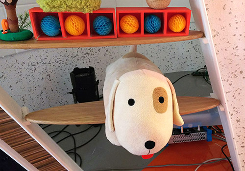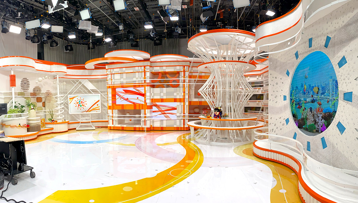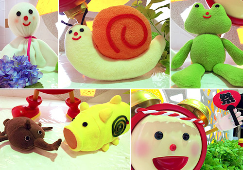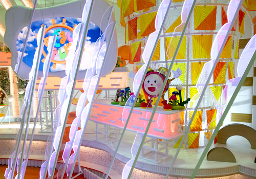 司会の背景には、楽しそうなオブジェがいっぱい並んでいます。