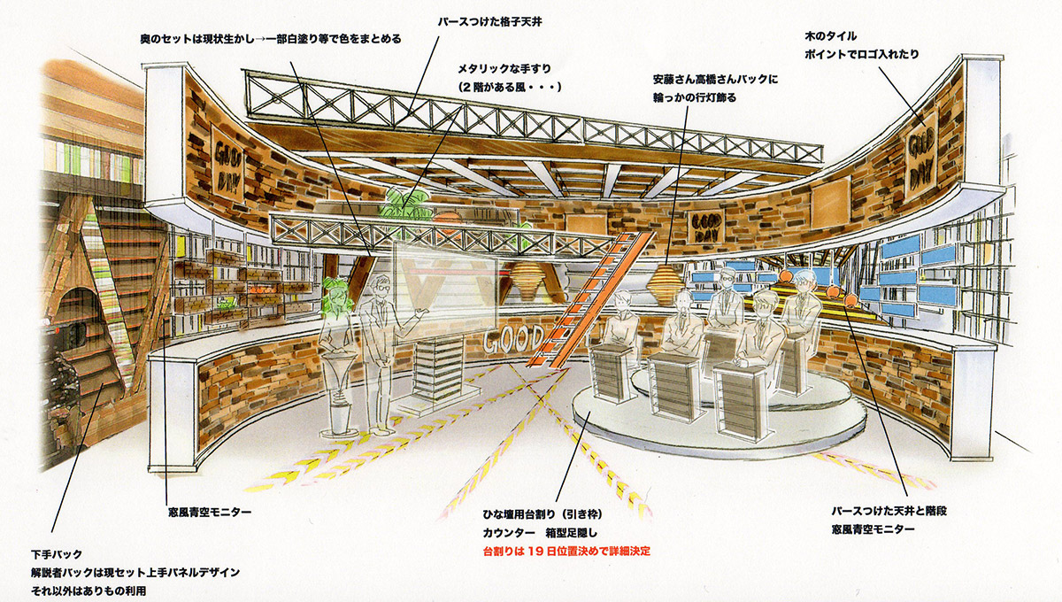 回を重ねるにつれて番組コンセプトが明確になってきて、もう少し落ち着いた、かつさわやかな雰囲気の中で情報を伝えていくのがいいのかな、という話になりました。そこで、晴れの日の空と光の色、青と黄色をスタジオと番組ロゴのベースカラーにして、ピンクや緑色はセットから外しました。色を取った所は木目に変え、空・太陽・木に囲まれた午後のひととき――という具体的なイメージのセットに様変わりしたのが今のものです。