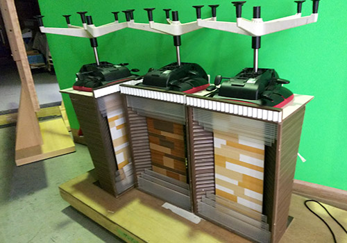 現在のセットの形に至るまでには紆余曲折しました。はじめは番組構成の詳細が固まっていなくて、プロデューサーからはただ一言、「積み木をモチーフにしようかなぁ……」と言われただけでした。積み木から「子ども部屋」を連想し、安藤さん・克実さんがいる場所となれば「大人の遊び部屋」をコンセプトにしてみようかと。色的にも遊びをたくさん取り入れ、カラフルなセットにしたのが最初でした。