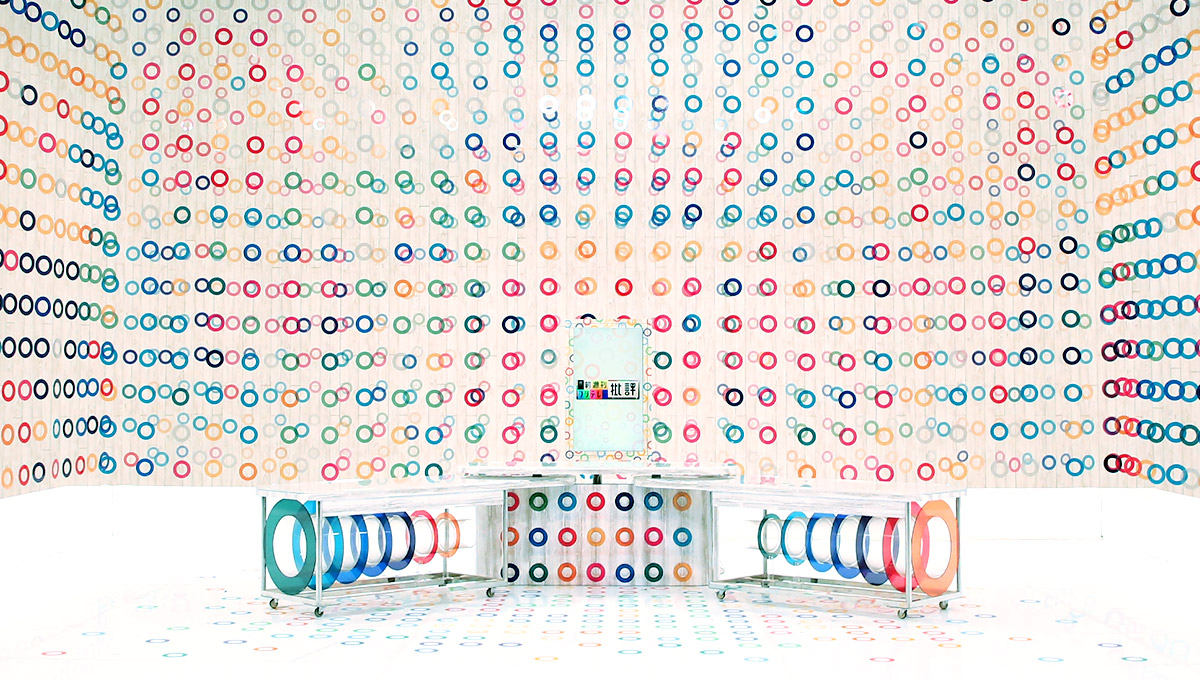 セットに吊っている色とりどりの透明の輪は全部で1,761個ありますが、正面は3層にして、異なる3つの色が重なって1つの色味を出すようにしています。そこには1つとして同じ色の組み合わせはありません。どこかに1つはきっと、お好みの色合わせがあると思うので、ぜひ探してみてください。