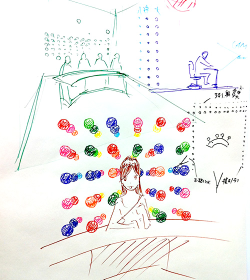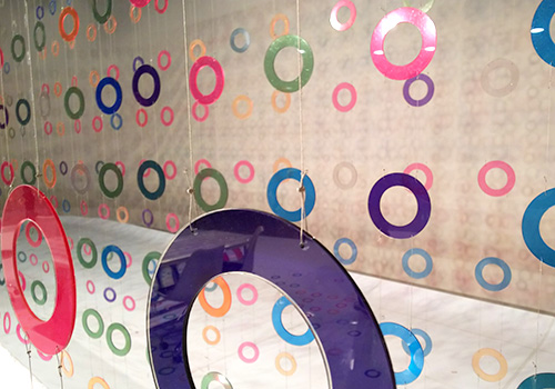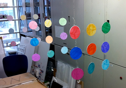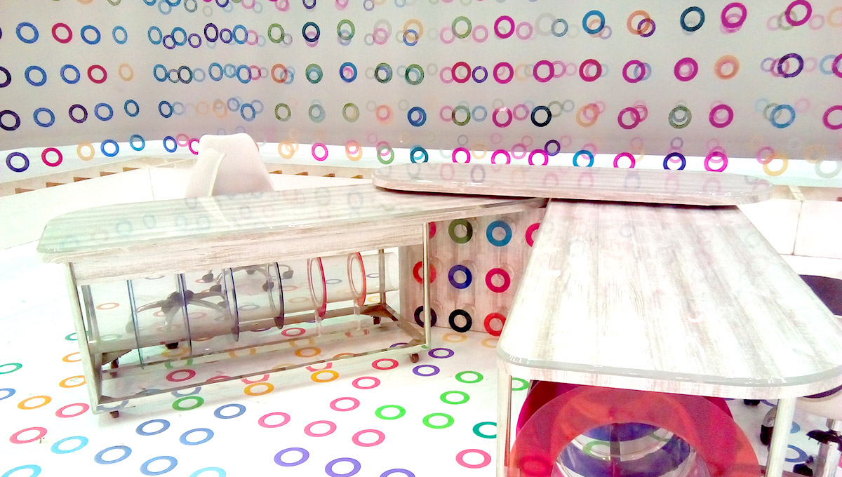 奥行きの検証、でしょうか。限られたスペース内で出来る限りの奥行き感を出すために、透明色のアクリルで作った輪の色の濃さや間隔のとり方を決めるのに、何度も実験を重ねました。背景が白なので、奥へ行くほど彩度を低く明度を高く、わかりやすく言うと、だんだん白っちゃけた色にしていって背景に溶け込んでいくように感じさせて、奥までの距離を長く見せる視覚効果を狙っています。