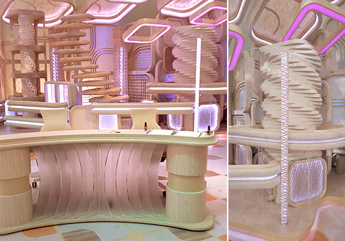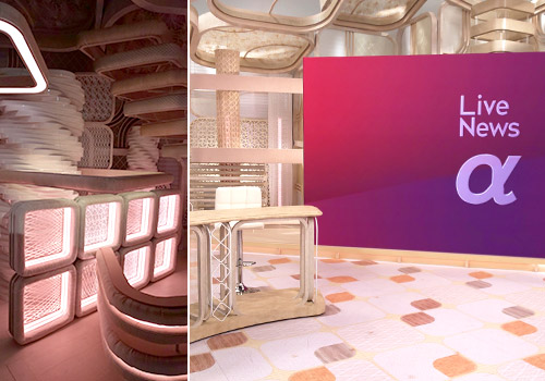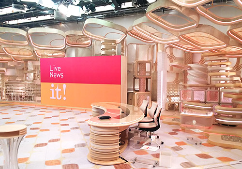 色味は床も含めて全体的に、抑えめのナチュラル色にしています。番組タイトルロゴは昼の『days』がピンク、夕方『it!』は黄色、夜の『α』で紫を使っていますが、セット内の大型LEDビジョンに映すロゴが映えるよう、あえて薄いベージュやアイボリーなどの控えたトーンの色でまとめました。