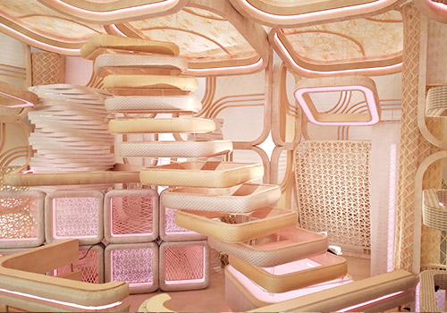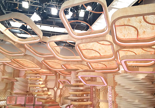 「柔らかい」、けれどもニュースに求められる「鋭さ」も併せ持つ何かをモチーフにしてみようかと考えました。その結果ベースに設定したものが「スクエアリング」です。形に主張はあるが角がない。シャープでソフト。この「スクエアリング」のいろいろな大きさ・素材のピースを組み合わせて、さまざまな空間表現をしてみました。