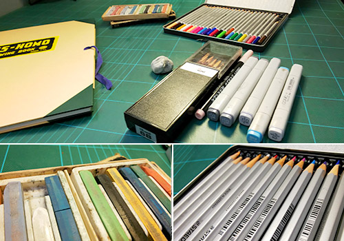 素早く現場で彩色できるよう、水彩絵の具は使いません。