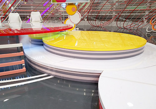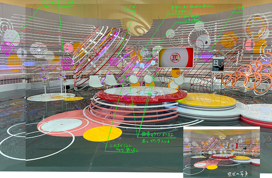新しいセットはその“波紋”を象徴した「円」をちりばめたデザインにしました。一番大きいオブジェはもちろん、MCが立つ台も円形。“波紋”はセットだけでなく番組の統一コンセプトとして、名前のテロップを乗せる座布団(=ベース)やワイプ(=画面の片隅で出演者の表情を映す小さな窓)の枠も、四角形の角を取った形にしています。モニターだけはさすがに角を削るわけにもいかないので四角のままですが(笑)。