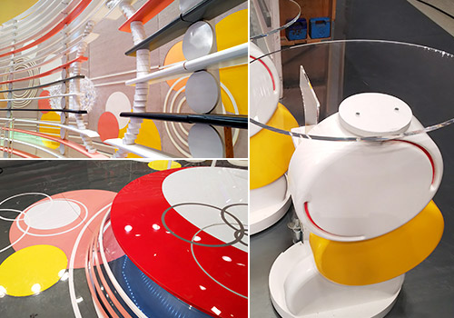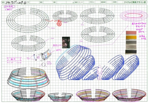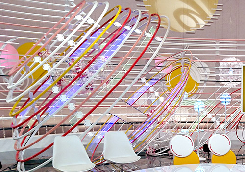 「全部のパーツが円のセット」って、自分でイメージ図を描いてみたのはいいけど、どうやって建てよう、と……。アートフレームのスタッフに発注、というよりほとんど悩み相談でした(笑)。鉄骨や木(モク)のいくつもの輪を組み合わせる際、それらを支えるのにどうしても1本のまっすぐな芯が要るんです。“波紋”が広がっている世界の中にその棒が入ってしまうのが嫌で、その支え棒の表にも小さな円をたくさん貼り付けて、棒を見えなくしています。円だらけのセットが建った後、あるスタッフには「本当に建ったんですね。こんな形のセットは無理かと思ってました」と言われました(笑)。