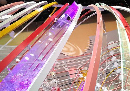 リング状の電飾ですね。導光板を使っているのですが、普通、導光板は板状のまま光らせたい素材にくっつけるところを、今回は輪の形に曲げたものを鉄骨に付けて光らせています。電飾スタッフとしても初の試みだったようです。