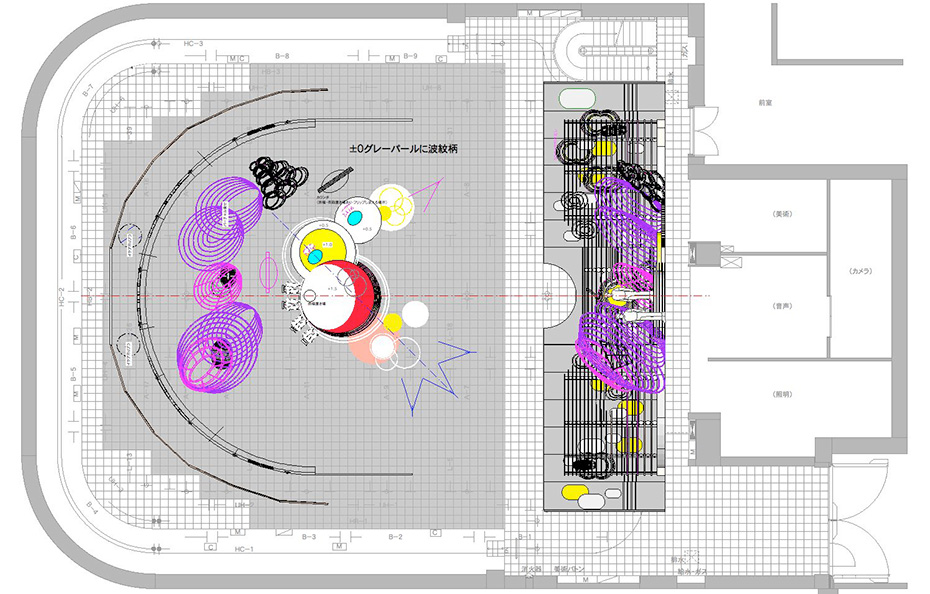 照明スタッフも触発されたのか、“波紋”柄の照明をノリノリで作ってくれました(笑)。