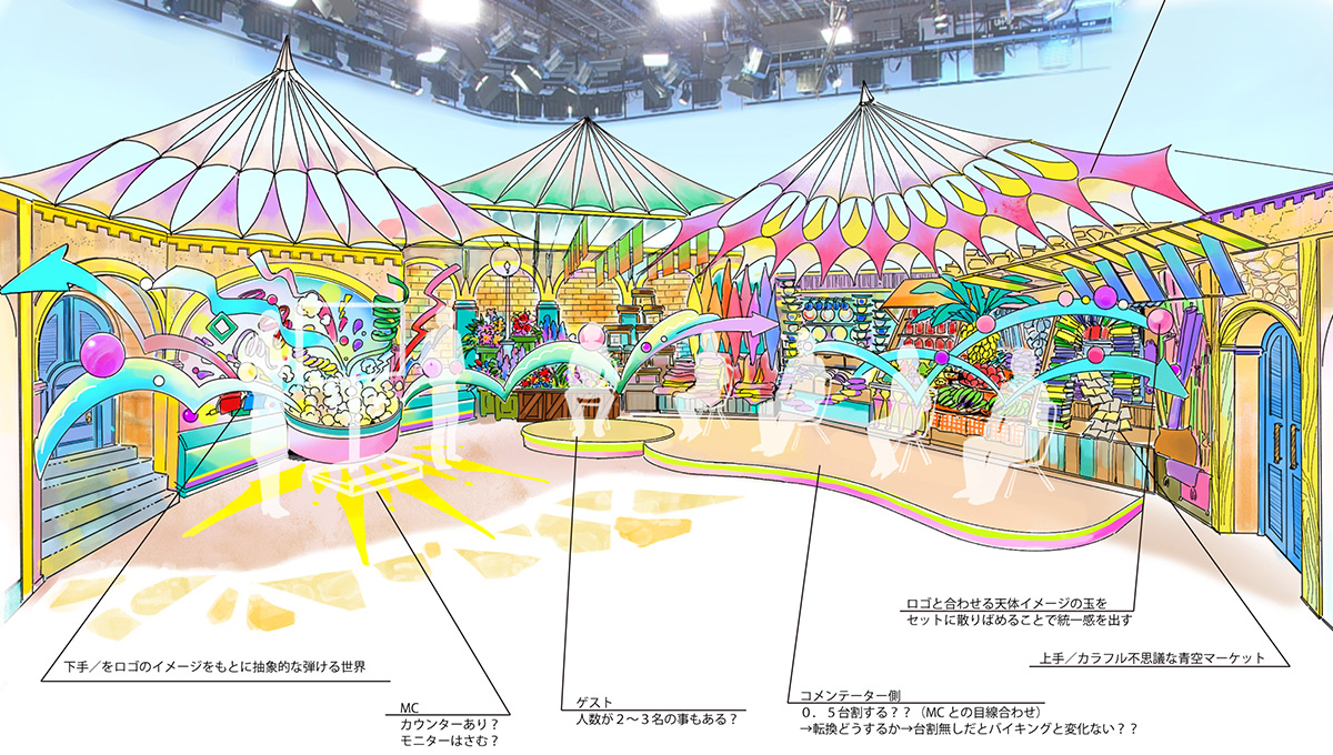 あとは、今はやはりどうしてもコロナ禍の影響で、出演者同士のディスタンスを保つ配置が求められるので、横広のセットになりがちです。マーケットの店が並んでいたり、矢印や球が弾んでいるオブジェを作ったりして、横へ広がる世界でも動きのある空間づくりを心掛けました。もちろんアクリルの遮蔽版も番組専用のものです。