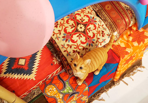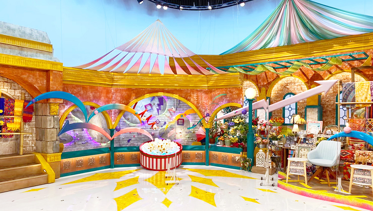 様々な情報を扱う番組の特色を、いろんな物が行き交う“青空マーケット”で表現しています。そこはカルチャーが交差する場所で、とにかく活気があって何もかもが動き出しそうな世界をイメージしています。不思議なスパイスも加えたいので、アラジンの世界というかちょっと魔法めいたニュアンスも意識しています。たとえば下手にあるポップコーンの入った容器の中や、壁に浮かぶ雲状のオブジェの裏などにテープLEDが仕込んであるのですが、その色味もエキゾチックにしています。LEDの特徴として色はもちろん調光も自由自在なので、明るさを変化させたり色を回したりといった電飾の技を使って、動き出しそうな雰囲気を狙いました。