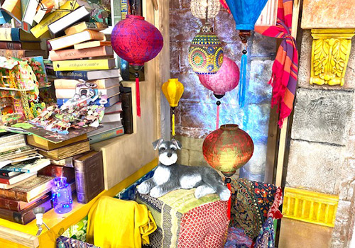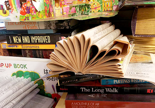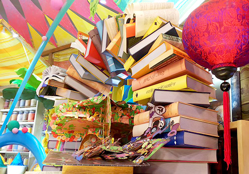「本屋さん」。装飾スタッフが数ページずつ丸めて作った
