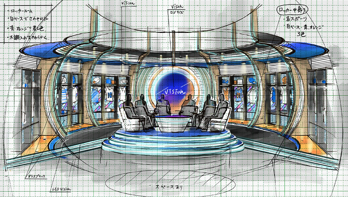 千鳥さんにちなんで「シチュエーション・コント」のような空間はどうかという話になり、打合せでも「スポーツバー」とか「選手のロッカールーム」とか色んなキーワードが飛び交ったのですが、とある日本代表チームのロッカールームの写真を皆で見ているうちに、そこで“ひざを突き合わせてスポーツについて話す”というイメージがしっくり来たという流れです。