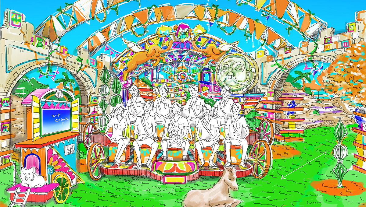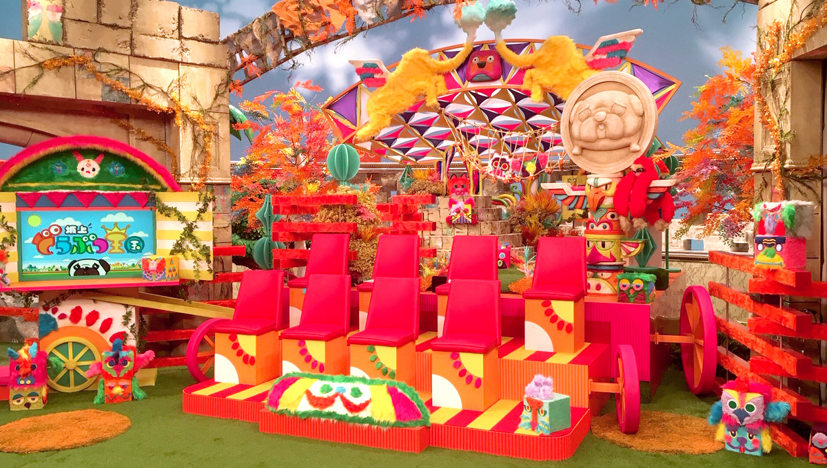 この番組は「大の動物好きの坂上忍さんが理想の動物王国を作る」というプロジェクトがベースにあるもので、プロデューサーからは初めに、「“動物王国”なので、広大な牧場をイメージしたセットで」と言われました。そこで人工芝をベースに敷くことにしましたが、牧場そのままでは面白味に欠けるので、ふれあいキャラバンのイメージも重ねました。出演者席の椅子はキャラバンワゴンの座席風にして、スタジオ全体のベースカラーはオレンジ。明るくポップな感じを出したくて。そこに、あたかも奥に動物の国が広がるようなアーケード風の屋根とアーチを置いて、今のセットに落ち着きました。
