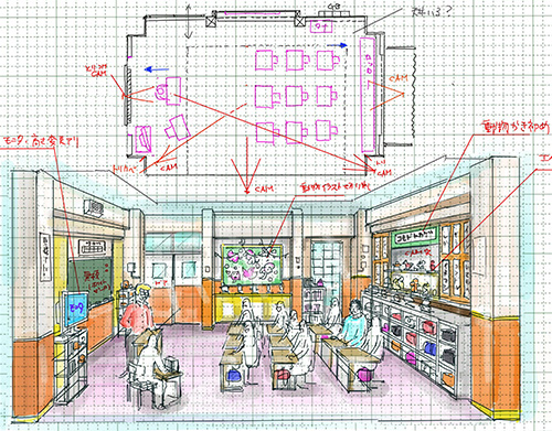 それと、メインセットとは別に、小学校の教室のセットも作ったのですが、小道具は全て動物にからめています。飾ってある絵や工作物はもちろん、習字のことばや本のタイトルまで。