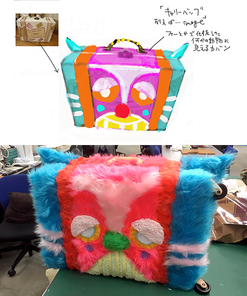 一つは、セットのところどころに置いている、四角い動物の飾りです。いろいろな動物が登場するので、飾りもあえて特定の生き物に見えないように四角で作って、スタッフの間では「キューブ動物」と呼んでいます。ロケに出るゲストが持つスーツケースも、周り一面をファーで覆って、大きな「キューブ動物カバン」にしました。