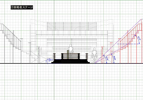 挑戦者たちが襲いかかるかのように、客席の傾斜は平均45度。