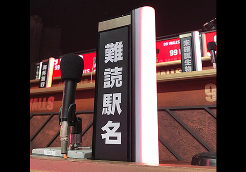 画面には映りませんが、逆に、来てくださった方々にとっては間近で見られる、さわれるセットなので、細かい部分にもこだわりました。レンガ風の壁紙もスタジオセットに合わせて何度も作り直しましたし、解答ボタンも本番と同じものを置いています。出番の前にこのボタンで早押しの練習をしている人もいて、「そういう用途もあったのか」と(笑)。