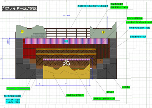 「四面楚歌」。四方を取り囲まれたコロシアム風にしたい、と言われました。それで、格闘技のリングをイメージしたステージを中央に置いて、そこに向かってあたかも高い壁が迫りくるような空間を作りたいと思いました。